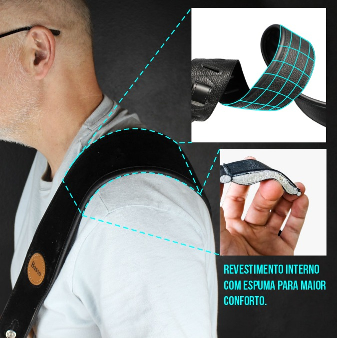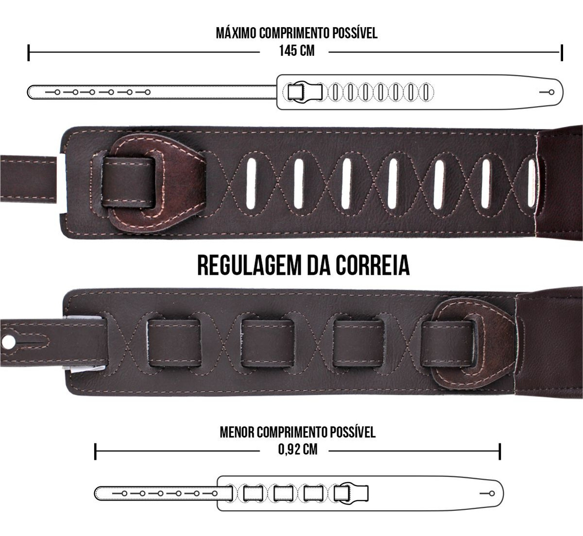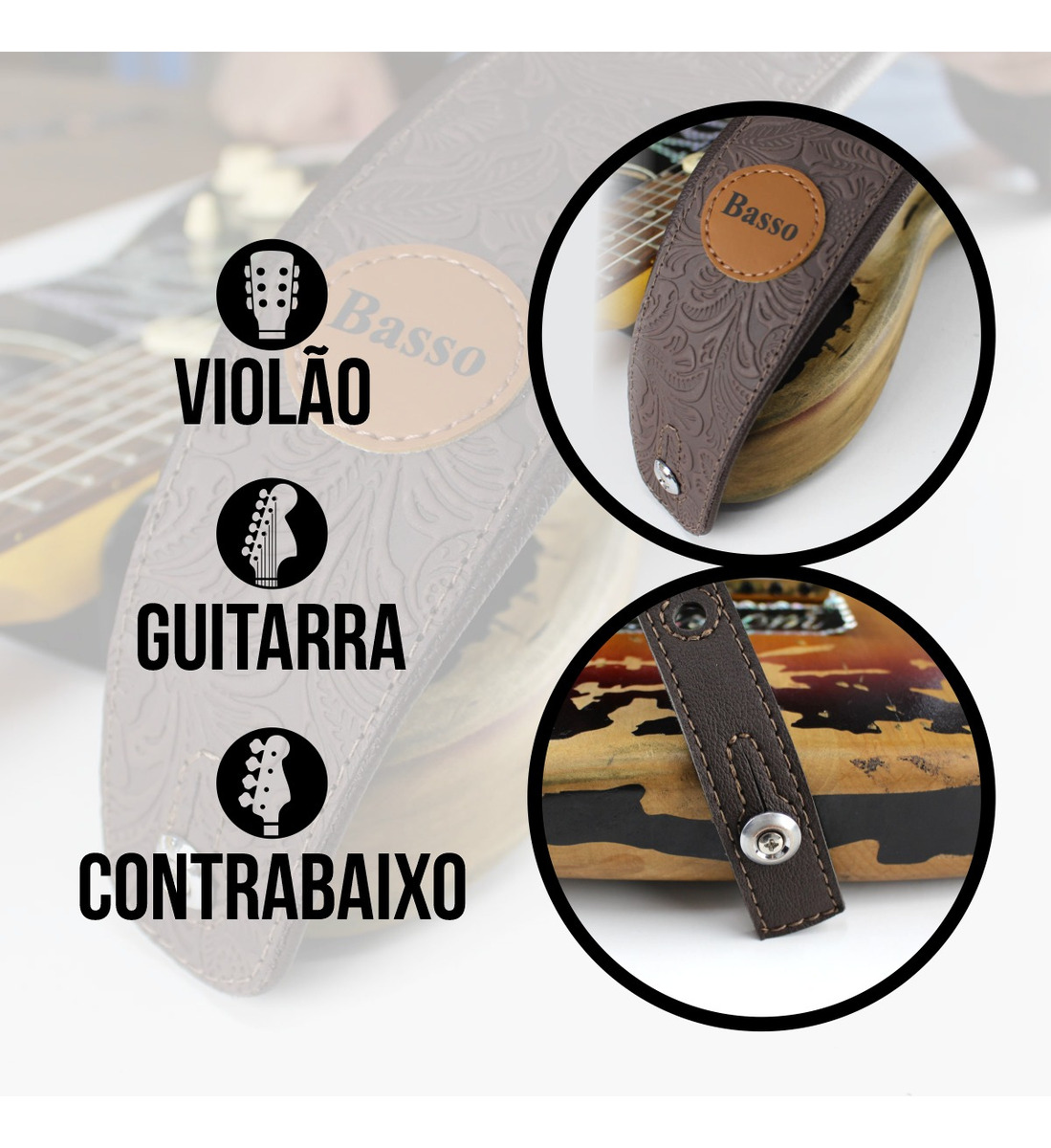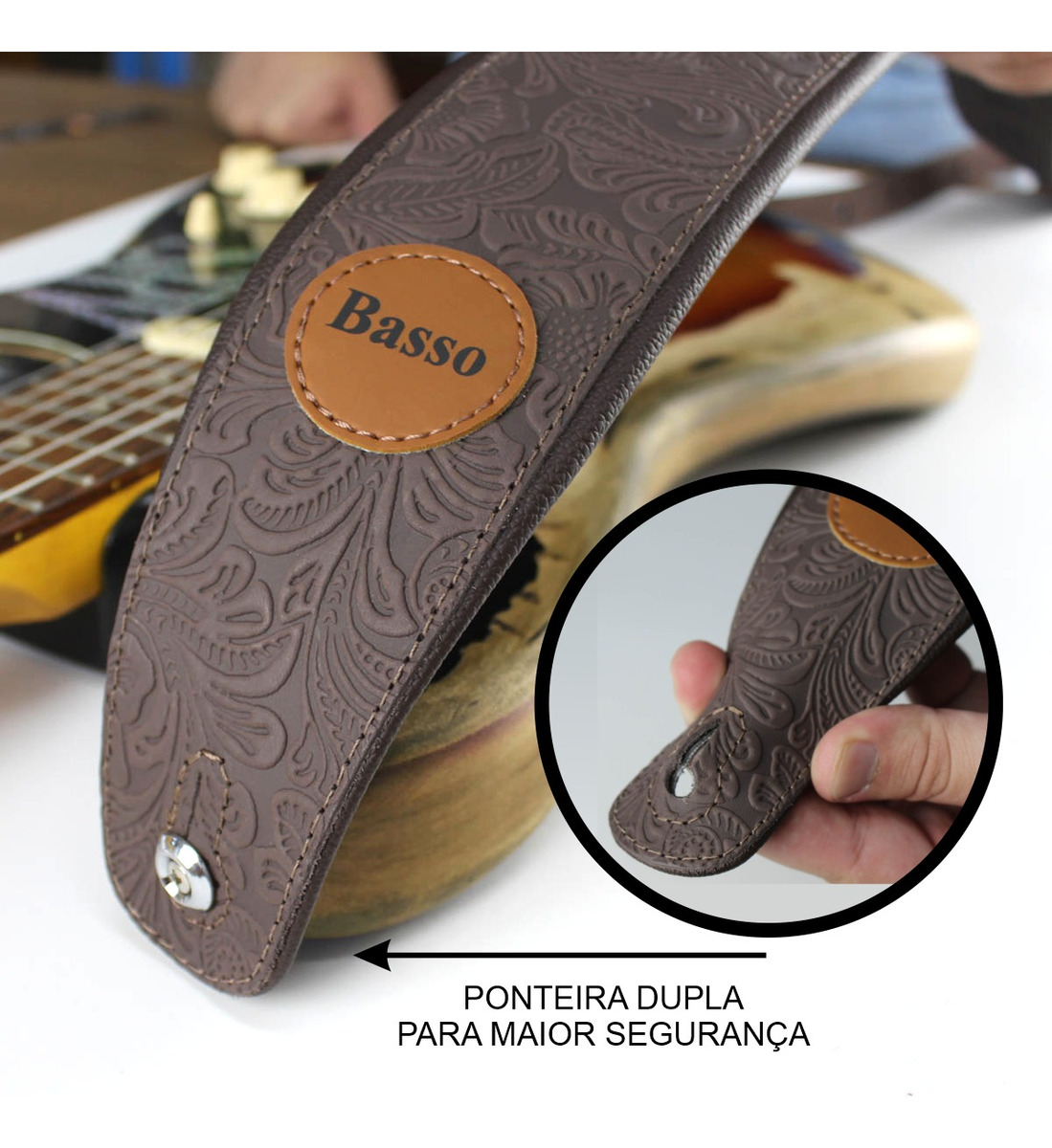Diferenciais: - Correia estofada, Distribuindo o peso do instrumento no ombro; - Conforto máximo; - Ideal para o palco e ensaio com os amigos; - Visual moderno; - Produzida em material couro macio; ____________________________________________________________________________ Correia VT SL 82 Especificações: - Correia para guitarra, violão e contrabaixo, reciclável, produzida em couro macio; - Ajustável entre 92 cm e 145 cm de comprimento; Largura de 7 cm (no ombro) - Reforço na ponteira, evitando que “esgace” com o tempo (+ segurança); - Forro sintético para evitar a absorção do suor; ____________________________________________________________________________ A BASSO | Ecostrap® é uma empresa especializada em design e comercialização de acessórios para instrumentos musicais, com destaque para as correias. Com sede no Rio Grande do Sul, possui 22 anos de experiência e busca aperfeiçoar seus produtos com base no feedback dos músicos. Sua matriz em Novo Hamburgo facilita o acesso às melhores tecnologias de produção. Líder de mercado, a BASSO | Ecostrap® oferece correias de alta qualidade, unindo estilo, segurança e conforto para músicos. ___________________________________________________________________________ As correias também devem agregar estilo e personalidade ao seu visual durante as apresentações ou ensaios. Escolha a correia ideal para você e aproveite ao máximo sua experiência musical. OBSERVAÇÃO IMPORTANTE: DEVIDO AOS RECURSOS FOTOGRÁFICOS, PODE HAVER VARIAÇÃO DE TONALIDADE CONFORME A RESOLUÇÃO DE TELA UTILIZADA, BEM COMO A TEXTURA DOS MATERIAIS VARIA DE ACORDO COM A PARTE DO MATERIAL ONDE É CORTADA.